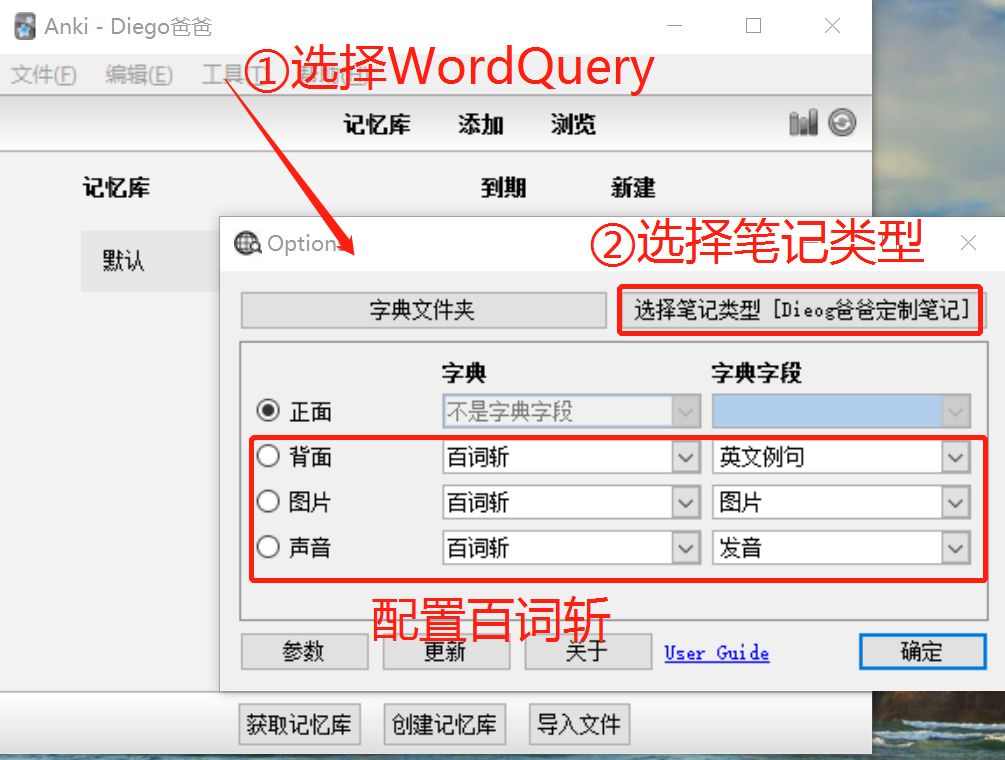 点击主界面的“工具”——WordQuery,出现下面的界面。确保选中“Diego爸爸定制笔记”笔记类型,确保四个字段中,除了第一个“正面”默认字段之外,另外三个四段选中的如图所示。