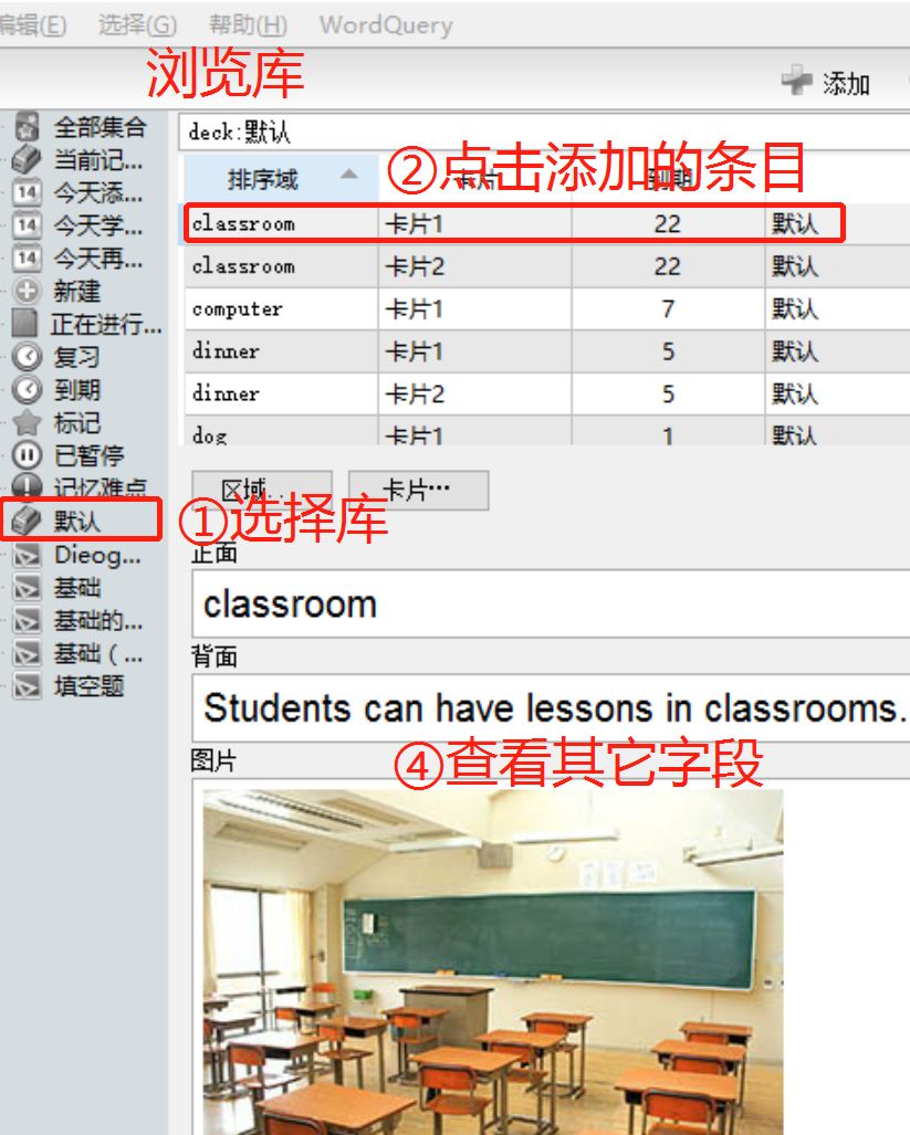 在“正面”的文本框中输入单词,点击“Query”按钮,WordQuery在后台把“classroom”这个单词传到百词斩服务器,然后把获取到的结果分别填充到其余三个字段。