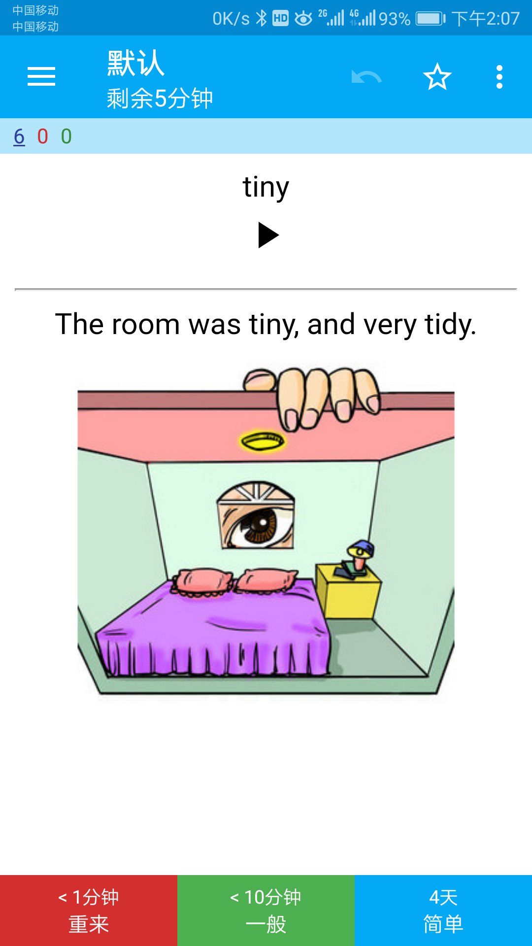 关键是正反面还能交换!也就是首次背单词时先出现tiny和发音,触屏后出现例句和图片。下次复习时先出现例句和图片,触屏后出现英文单词和发音。
