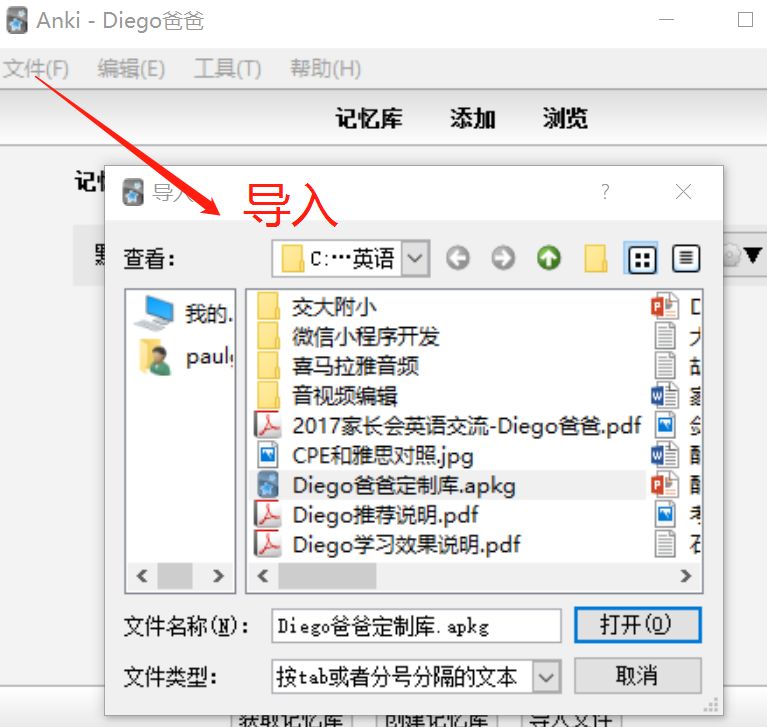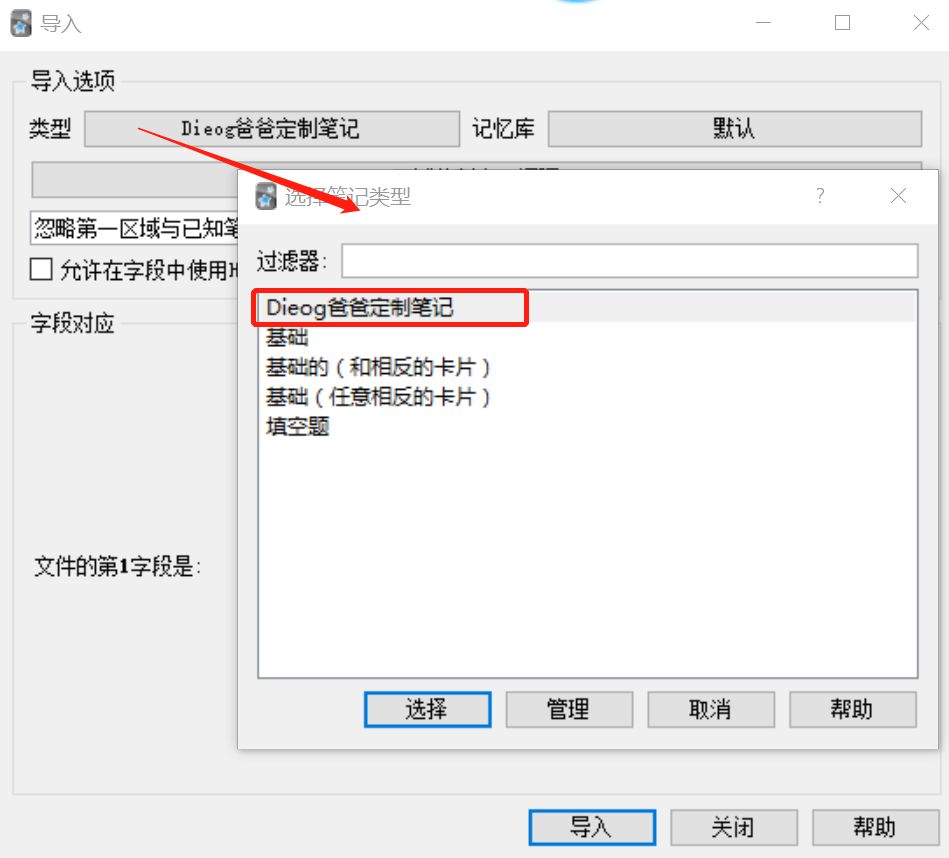 选择上述单词文件,并为导入的单词指定笔记类型和记忆库。此处应选择“Diego爸爸定制笔记”。