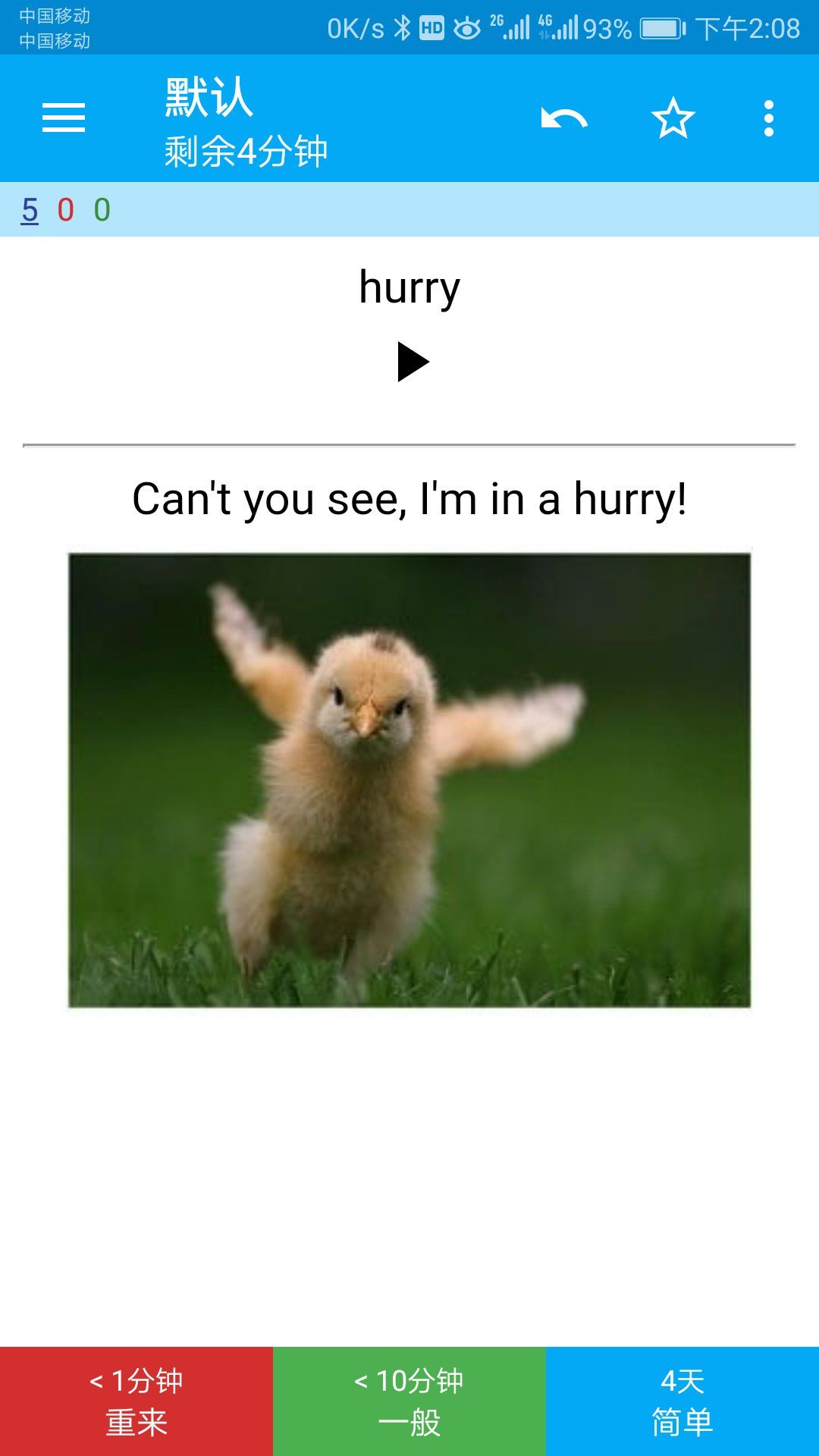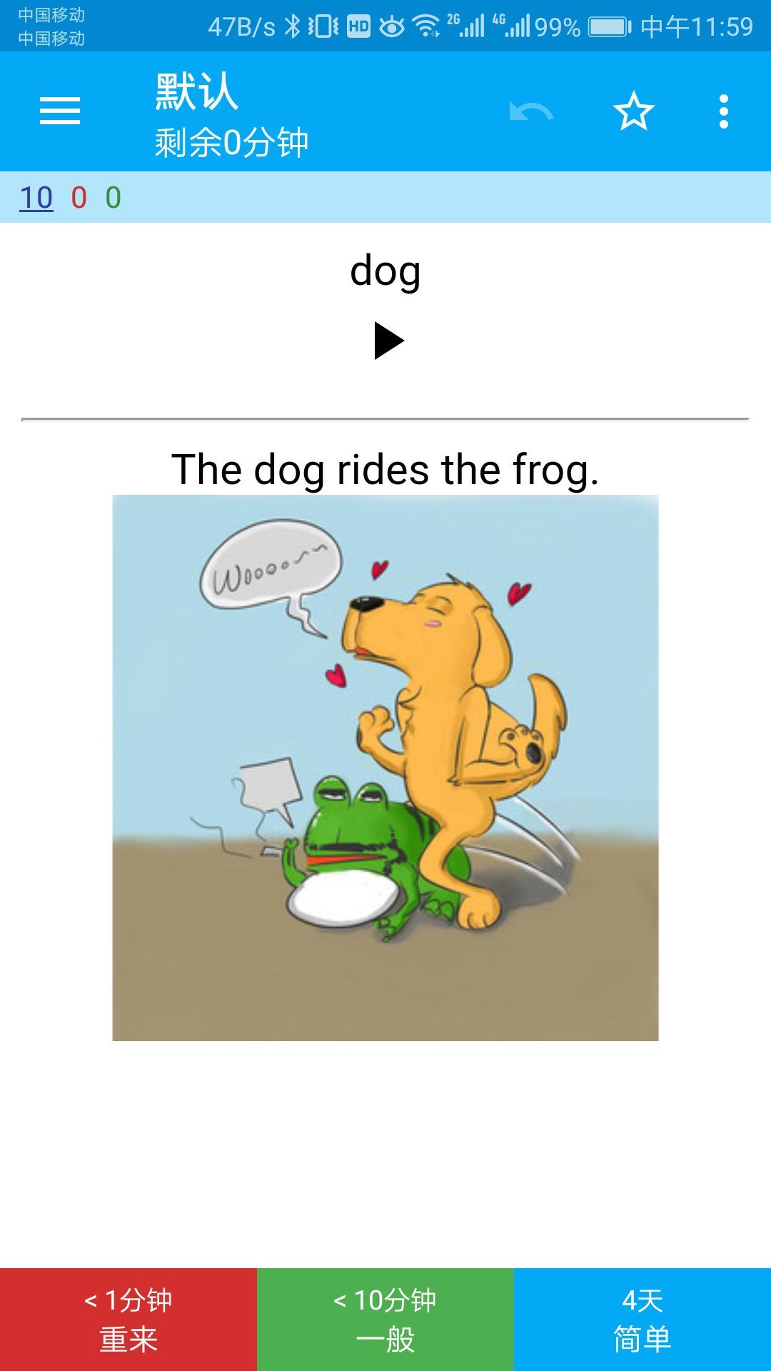 A1:在英文版中,1m表示1分钟,4d表示4天。当一个新词出现后,用户根据自己对这个词的掌握情况,如实地点击对应的按钮,反馈给anki。anki根据这个反馈按人类的遗忘曲线算法重新计算该单词下次出现的时间。