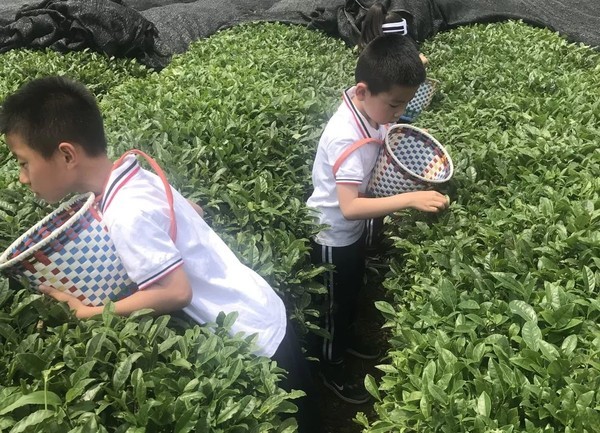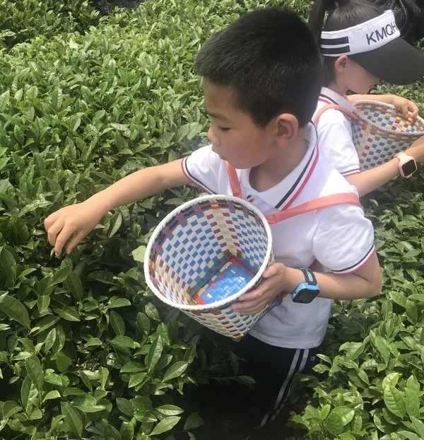 茶山上一片碧绿,虽然茶叶盛季已过,但还是吸引来了不少采茶小哥和小妹。你瞧,他们背着小茶篓的样子,还真是挺像模像样的了。