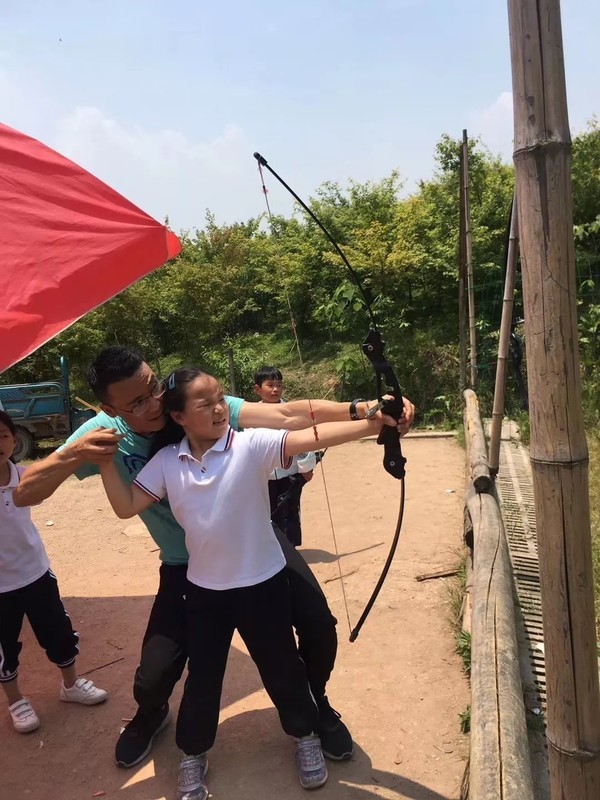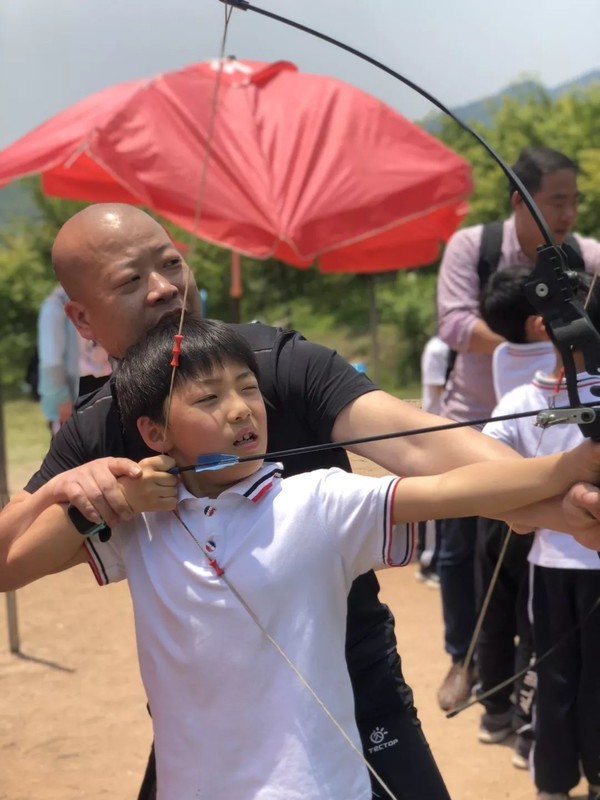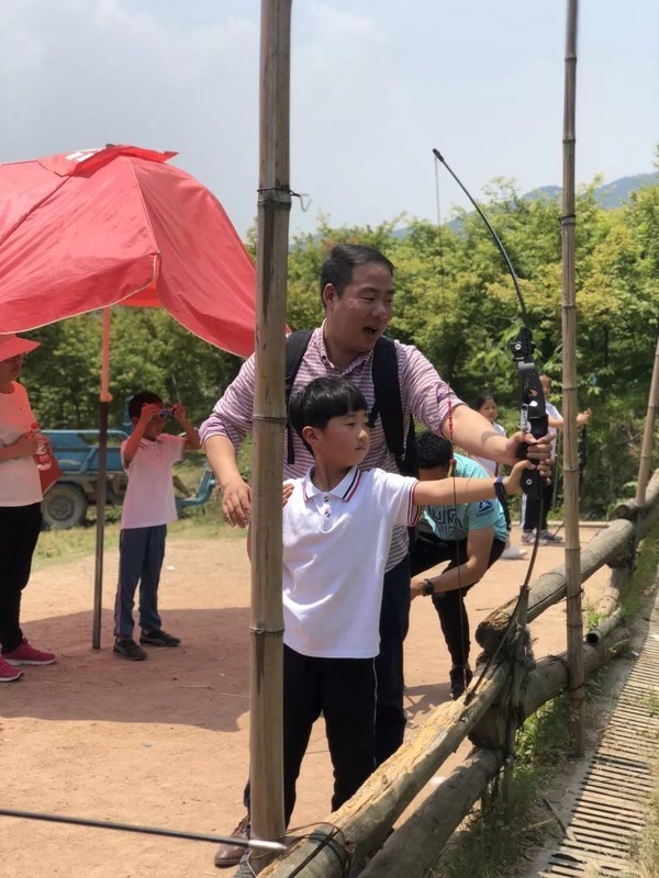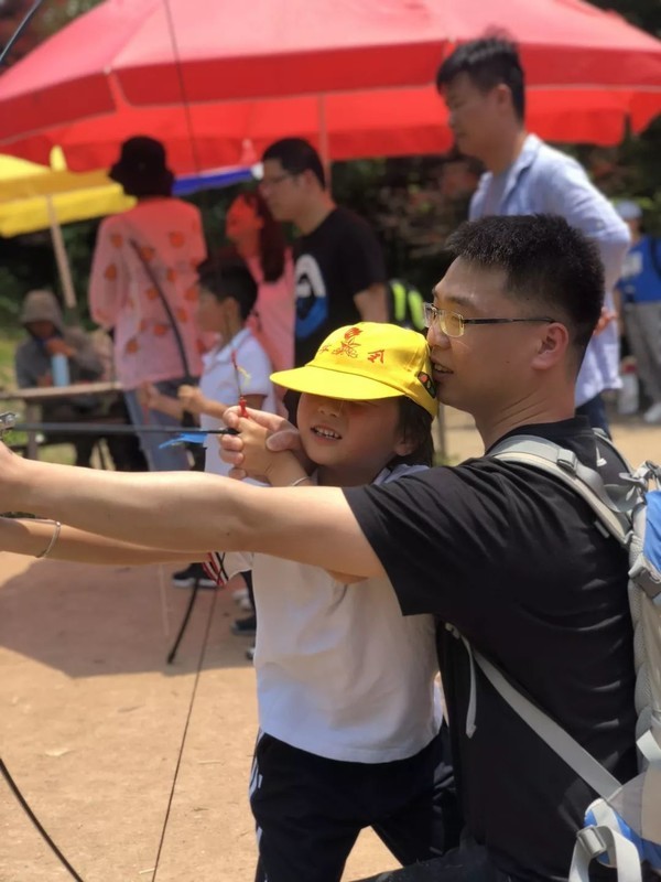 接着,我们又来到了射箭基地。一把把大弓与小朋友一般高,几位男家长不由自主地当起了教练,手把手教孩子们拉弓射箭,这画面多么和谐啊!