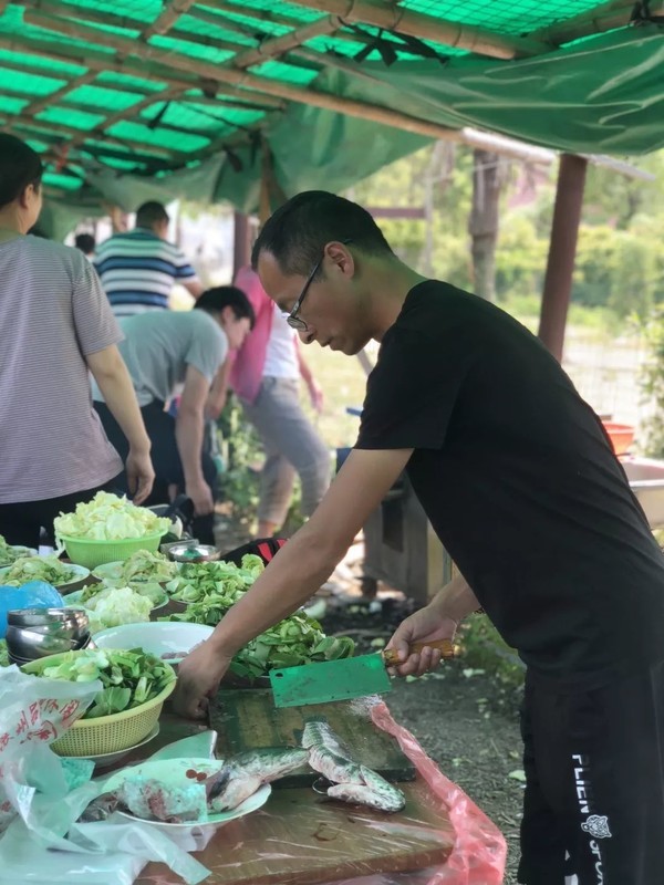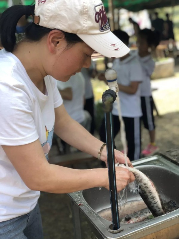 中饭时间到了,“大厨们”上场了,洗的洗,切的切,烧火的烧火,炒菜的炒菜。开饭喽!大家吃得好香!