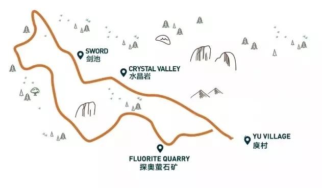 莫干山桃坡探险乐园——庾村——莫高坞——水晶岩——剑池——芦花荡公园——鹤啄泉——百步岭——裸心堡——萤石矿——庾村——莫干山桃坡探险乐园