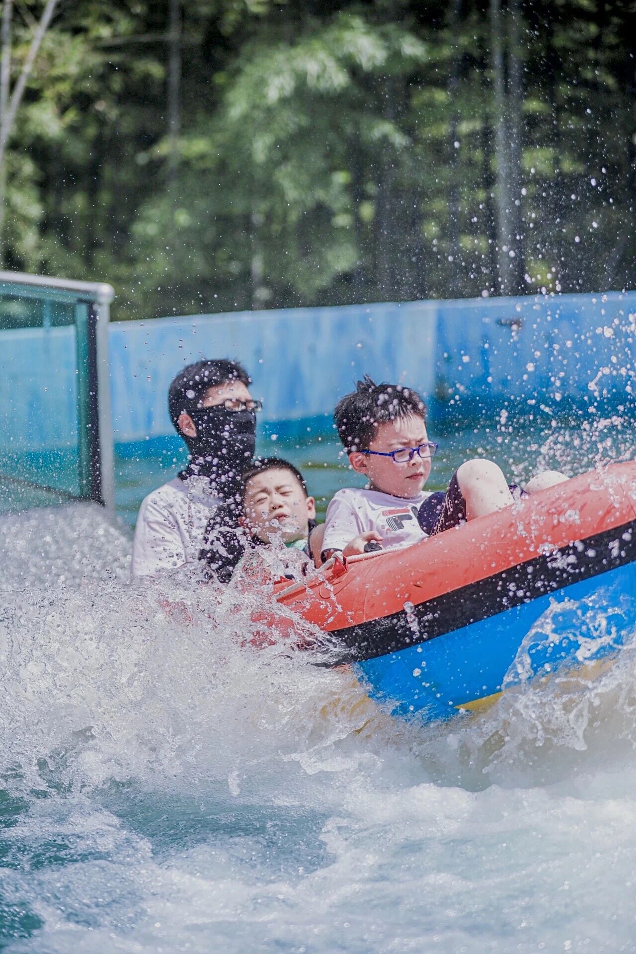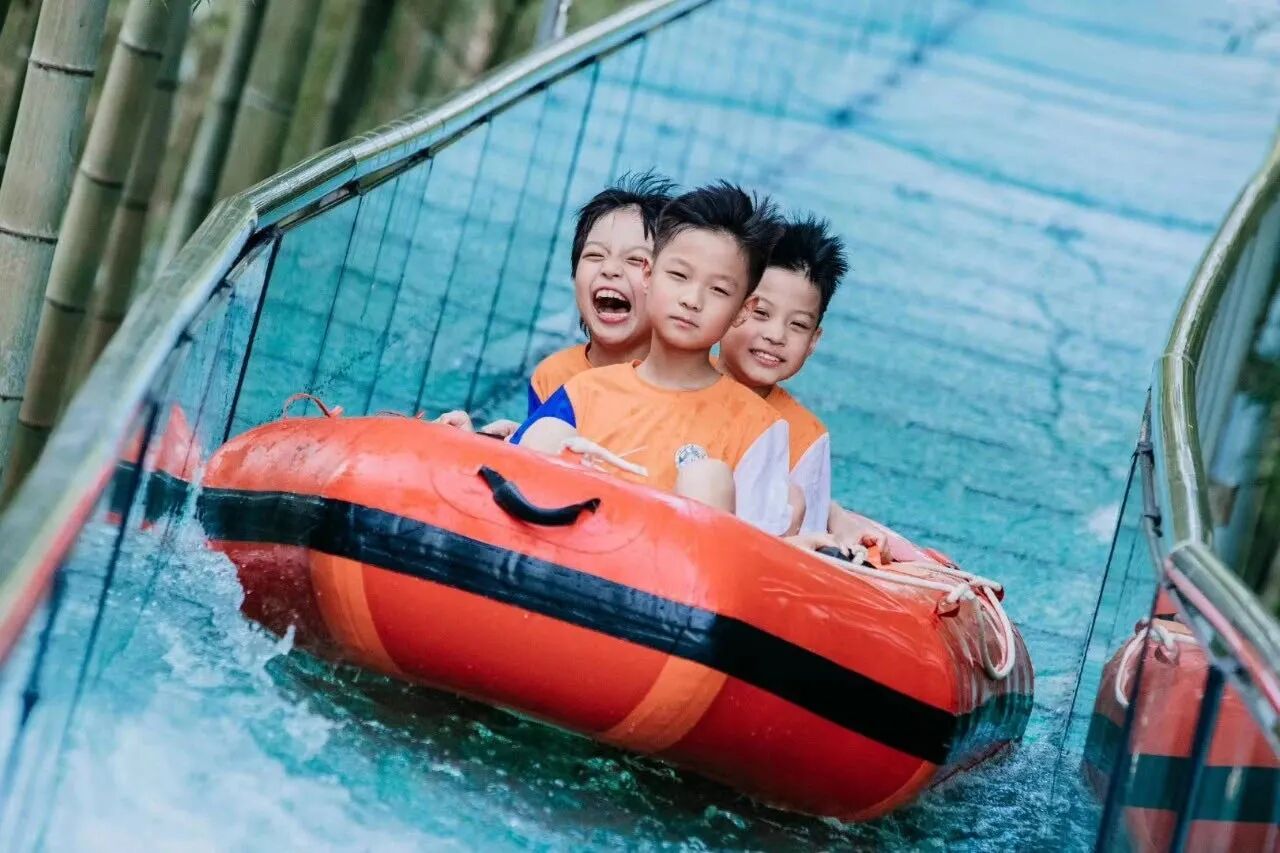 玻璃滑道:采用全钢架结构设计,铺设高透钢化玻璃,其全长2000米,从山峦高处顺势而下,水流湍急。当漂流筏经过人工设置的S形弯道时惊险刺激,是国内少有的漂流体验项目。