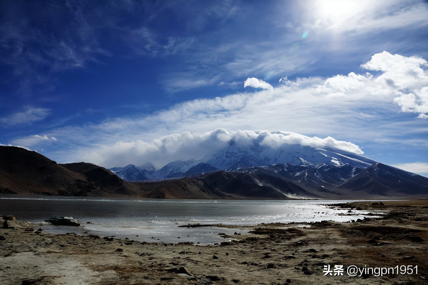 冰山之父----慕士塔格峰远眺。山顶终年白雪覆盖,云雾缭绕,十分神秘
