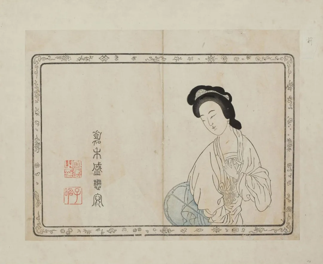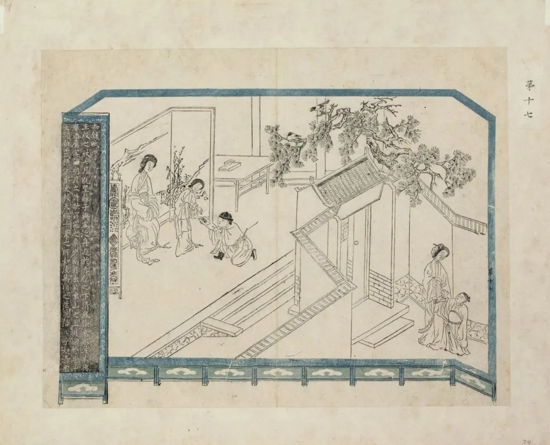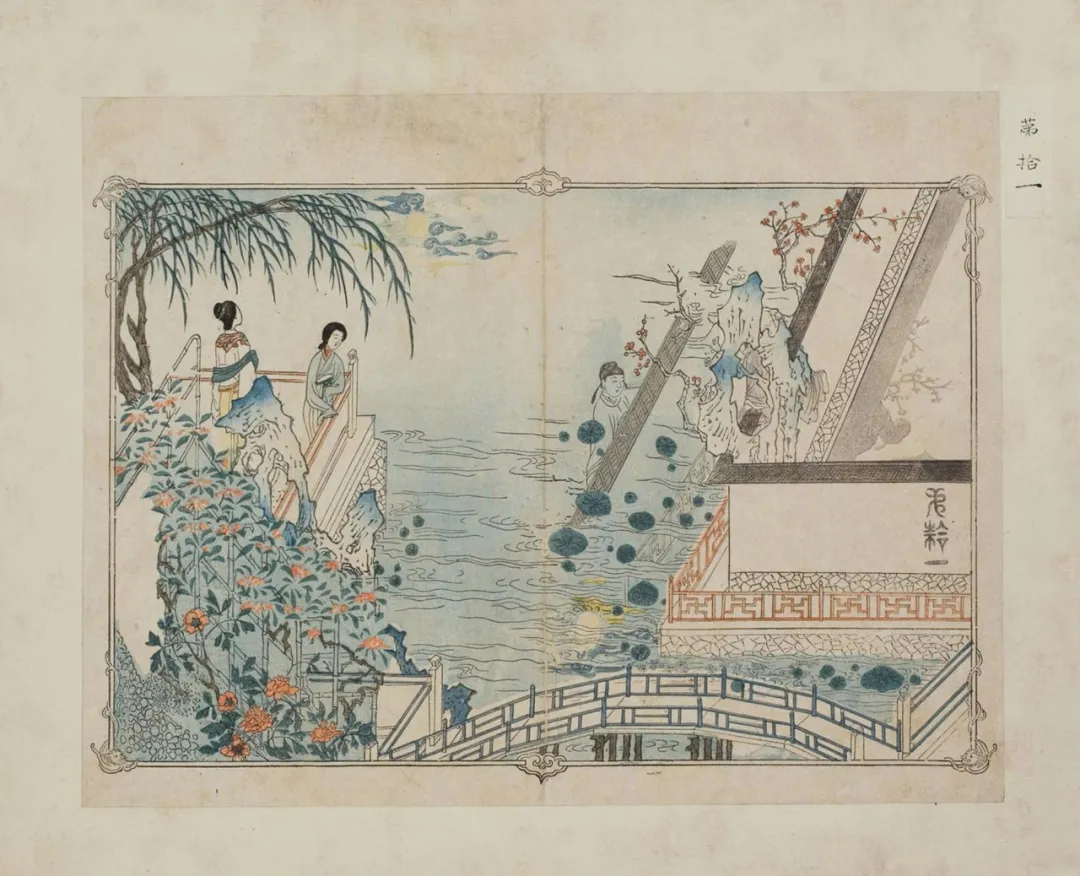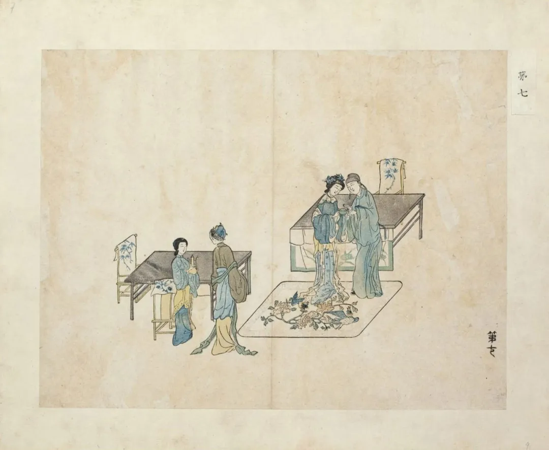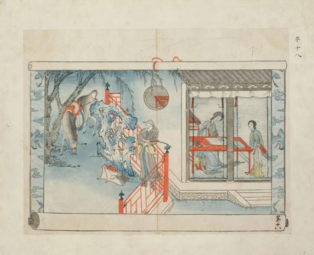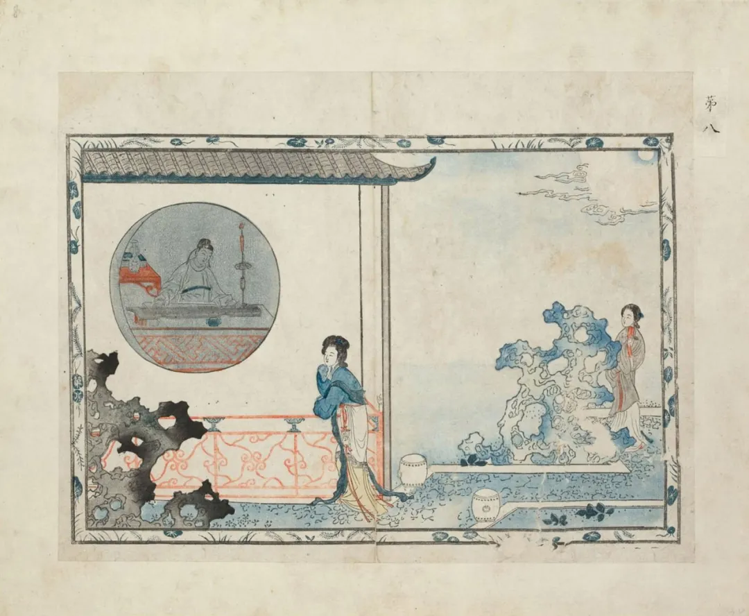 图八:写莺莺夜听张生抚琴。边框饰以花草,与卷首莺莺像相似。此外,值得注意的是画中二石鼓凳,取上圆下方透视法,与传顾恺之《列女仁智图》中器物手法类似,亦为中国传统绘画之常见透视样式。