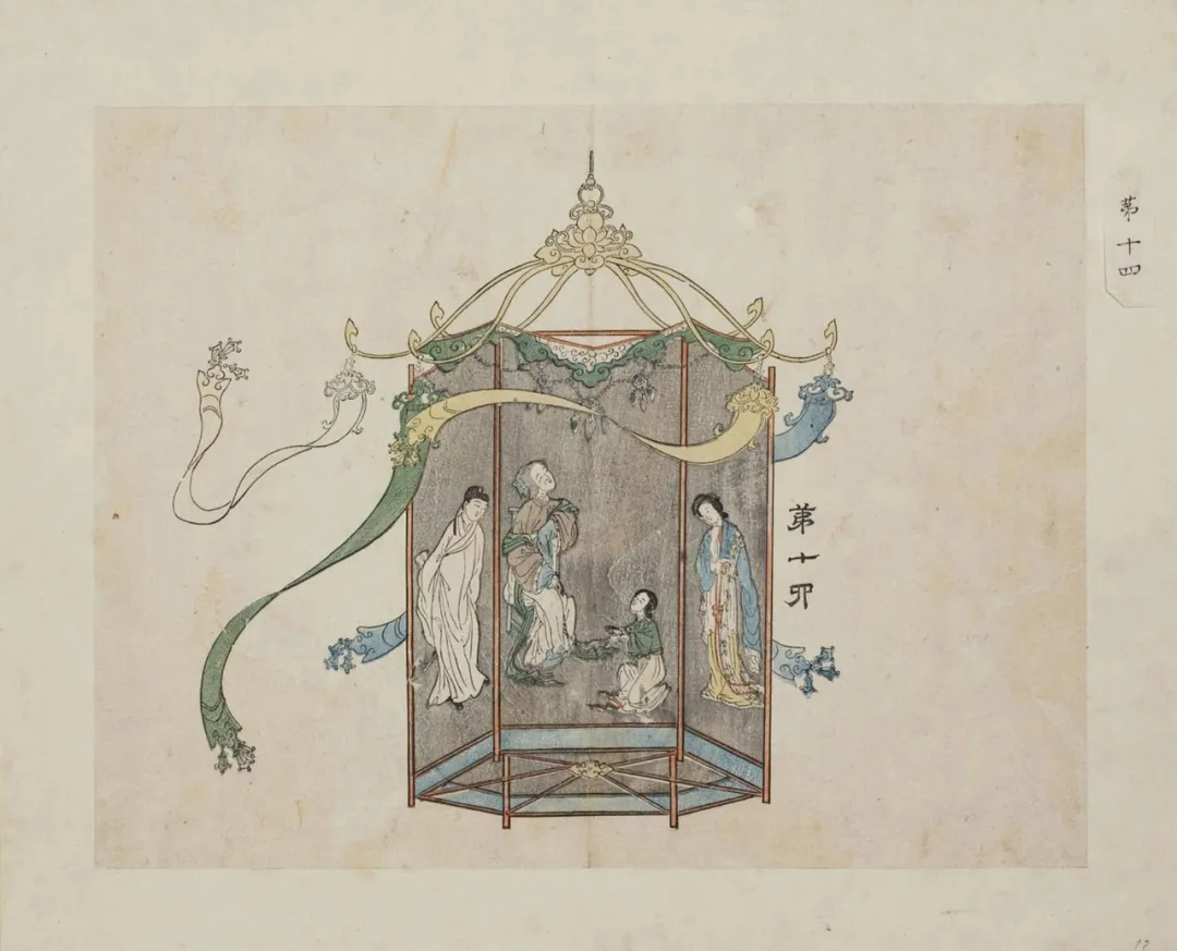 图十四:写老夫人看破内情拷问红娘。绘宫灯一盏,正面绘老夫人与红娘,左右两侧绘张生与崔莺莺。三个画面之间以灯架相隔,使不在同一空间的人物得以同时出现。