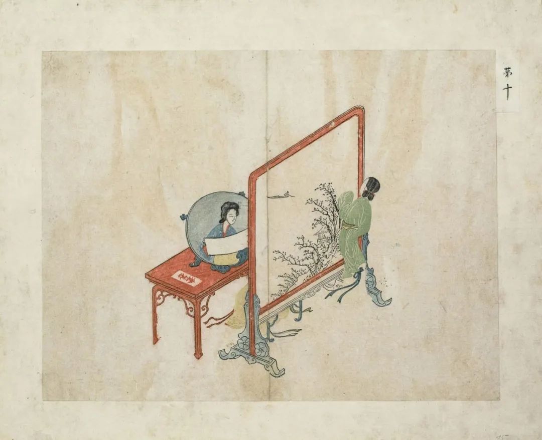 图十:写莺莺展读张生书信。图绘屏风一面,隔开莺莺、红娘,莺莺形象出现于梳妆镜中。