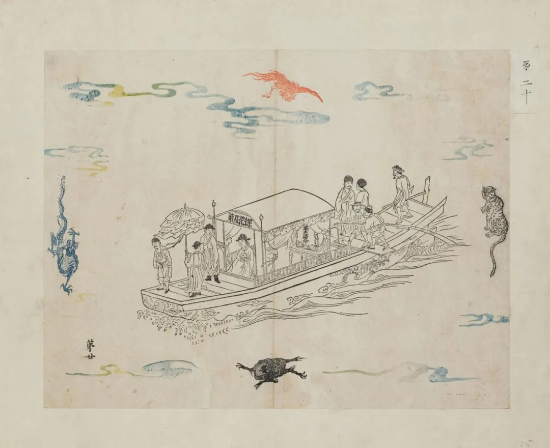 图二十:写张生及第封官,往普救寺迎娶莺莺。画中央绘官船一艘,张生安坐船头,志得意满,仆从众多。船之四周,环绕五彩祥云及青龙、白虎、朱雀、玄武四方神灵。