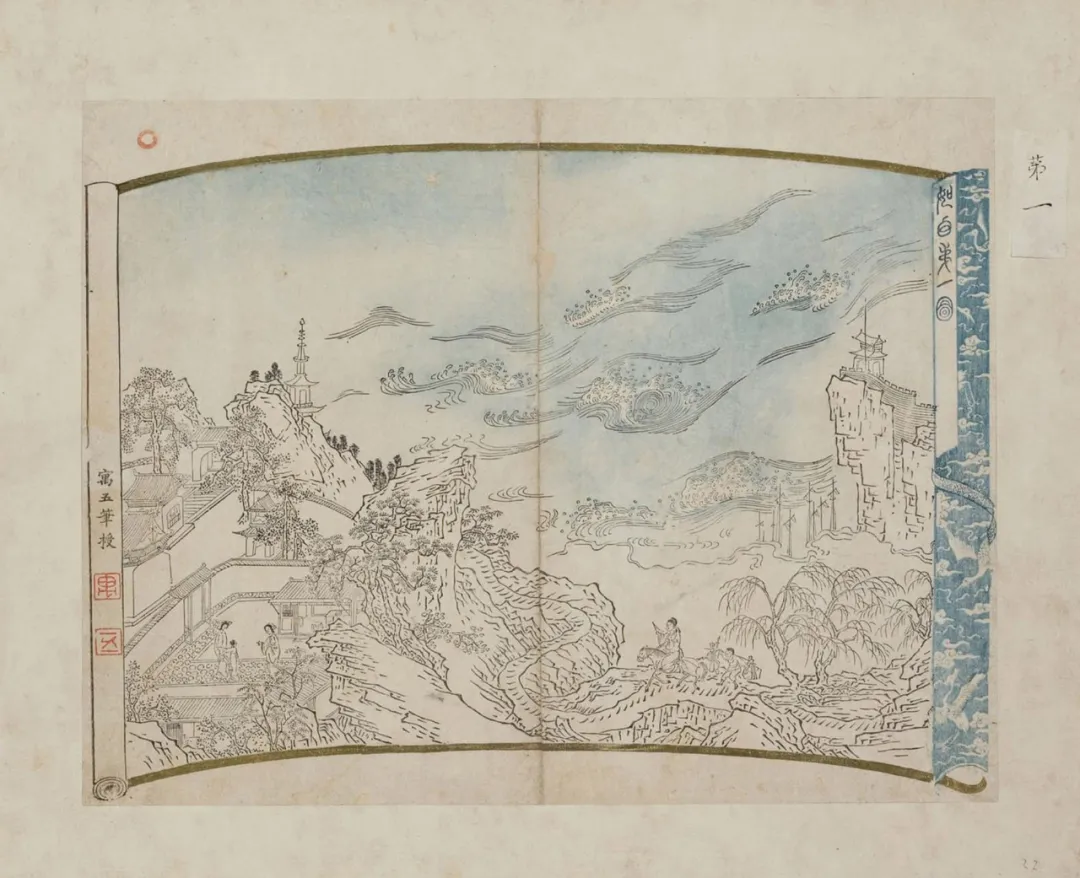 图一:写张生初往普救寺投宿之情景。借中国传统绘画手卷形式加以表现。右侧起首处有篆书「如玄第一圖」,左侧起首处有「寓五筆授」款及「寓」、「五」两方朱文印。