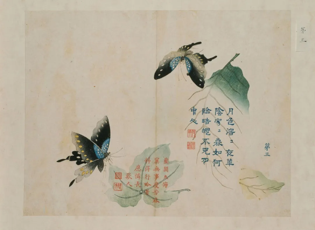 图三:写张生与莺莺隔墙酬韵。此图精绘彩蝶两只,以饾版技艺出之。并以不同书体钞二人诗句于树叶之上,取 “红叶漂诗” 之典。张生诗下钤朱文印「張珙」、白文印「字君瑞」,莺莺诗下钤白文印「鶯鶯」、朱文印「雙文」。
