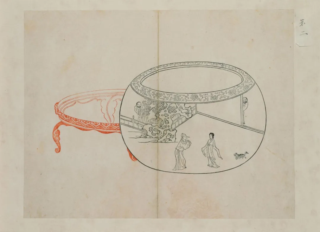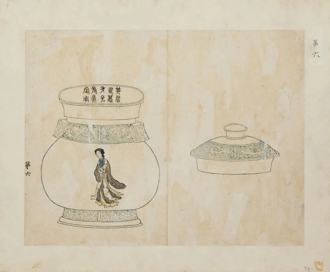 图六:写红娘奉命请张生赴宴。将人物绘于青铜器物 “觯” 壁。“觯” 为宴饮之酒杯,暗合邀宴之意。此觯盖、颈、足三处分别绘以夔龙、饕餮、窃曲纹样,内壁有金文:「其眉壽萬年子子孫孫永寶用」。此图或来源于博古图类版画。