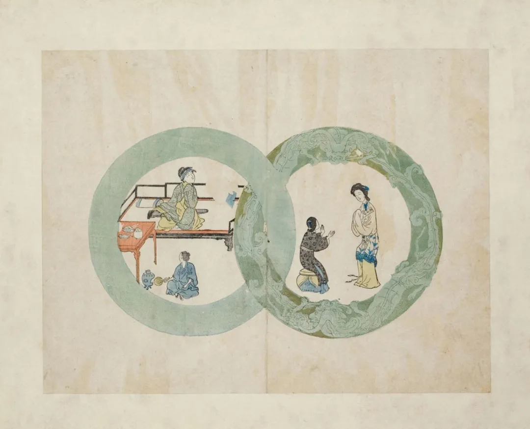 图十二:写张生因相思成疾,莺莺着红娘递简。此图借相扣之玉环构图,既同时表现了两个场景,又暗寓鸳盟已成。