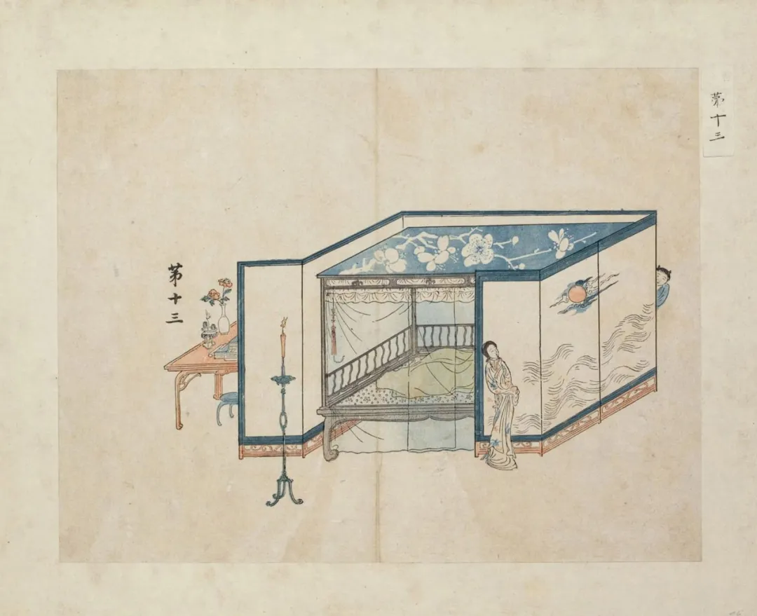 图十三:写莺莺赴约,与张生欢会。图中屏风曲展,碧纱低垂,牙床上惟露锦被一端,红娘、琴童则于屏外含笑静听,意境雅致,引人遐思。