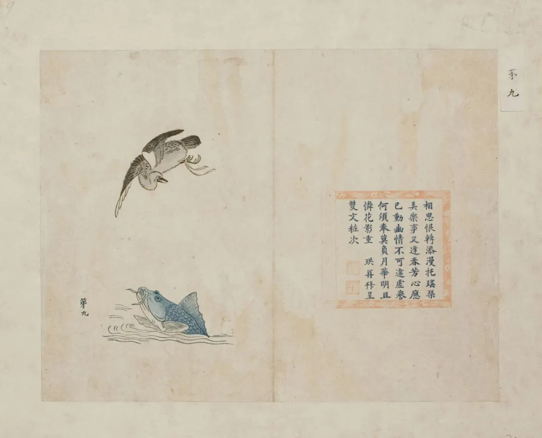 图九:写张生请红娘传书莺莺。画面右方展开一卷,上书张生之信,钤印二方「張珙」(朱文)、「字君瑞」(白文)。左方绘鱼、雁各一,合 “鱼雁传书” 之意。