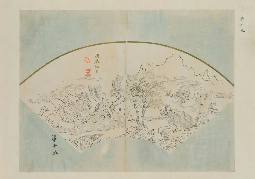 图十五:写莺莺于十里长亭送别张生。全图绘于扇面,以白描法写郊外秋景。画面上方有「庚辰秋日」题款及「寓五」朱文印。