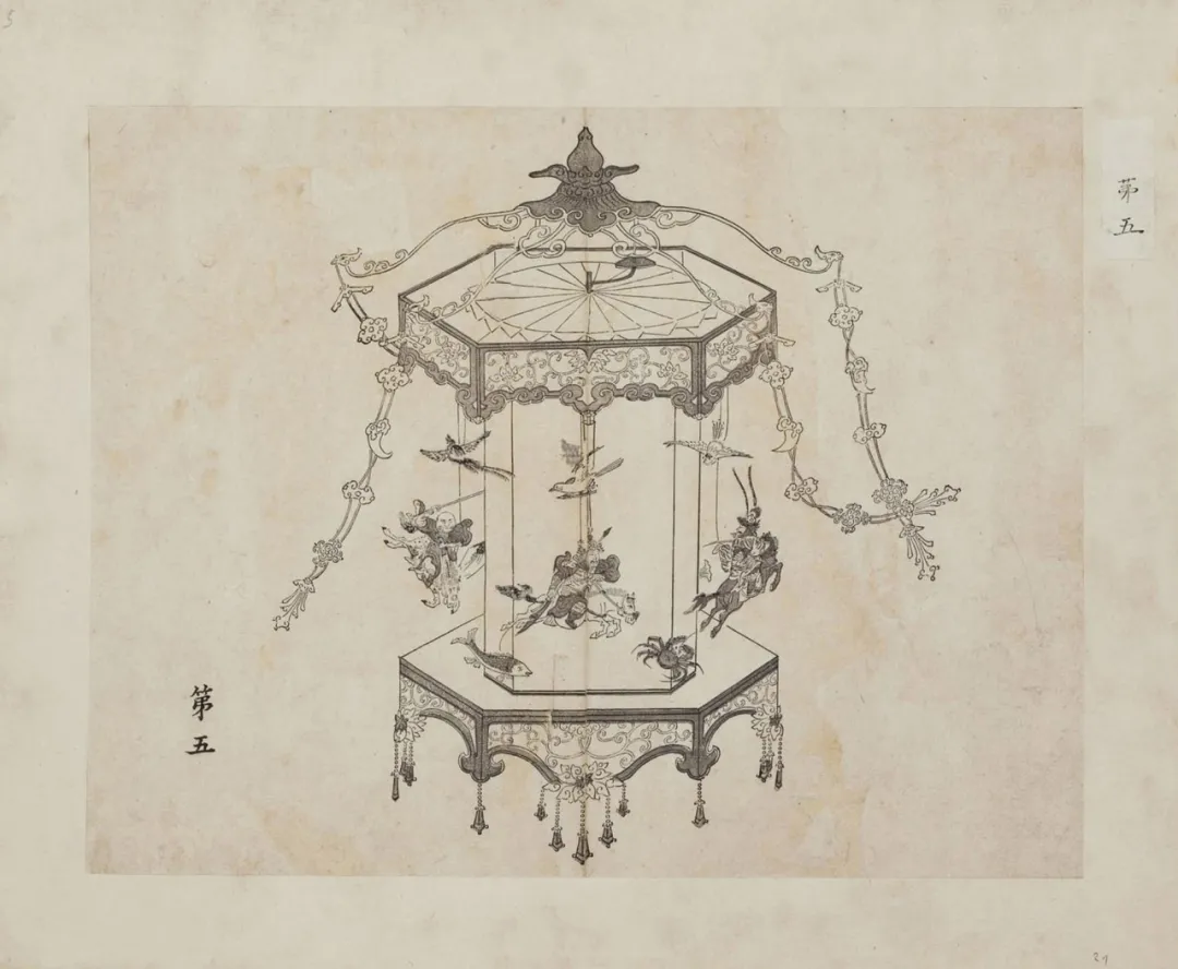 图五:写杜确、惠明追击叛将孙飞虎。借民间工艺走马灯的形式加以展现。此灯纹饰繁复、流苏华丽。将故事中三骑飞驰追逐的场面置于其中,既紧扣文意,又饶有情趣。
