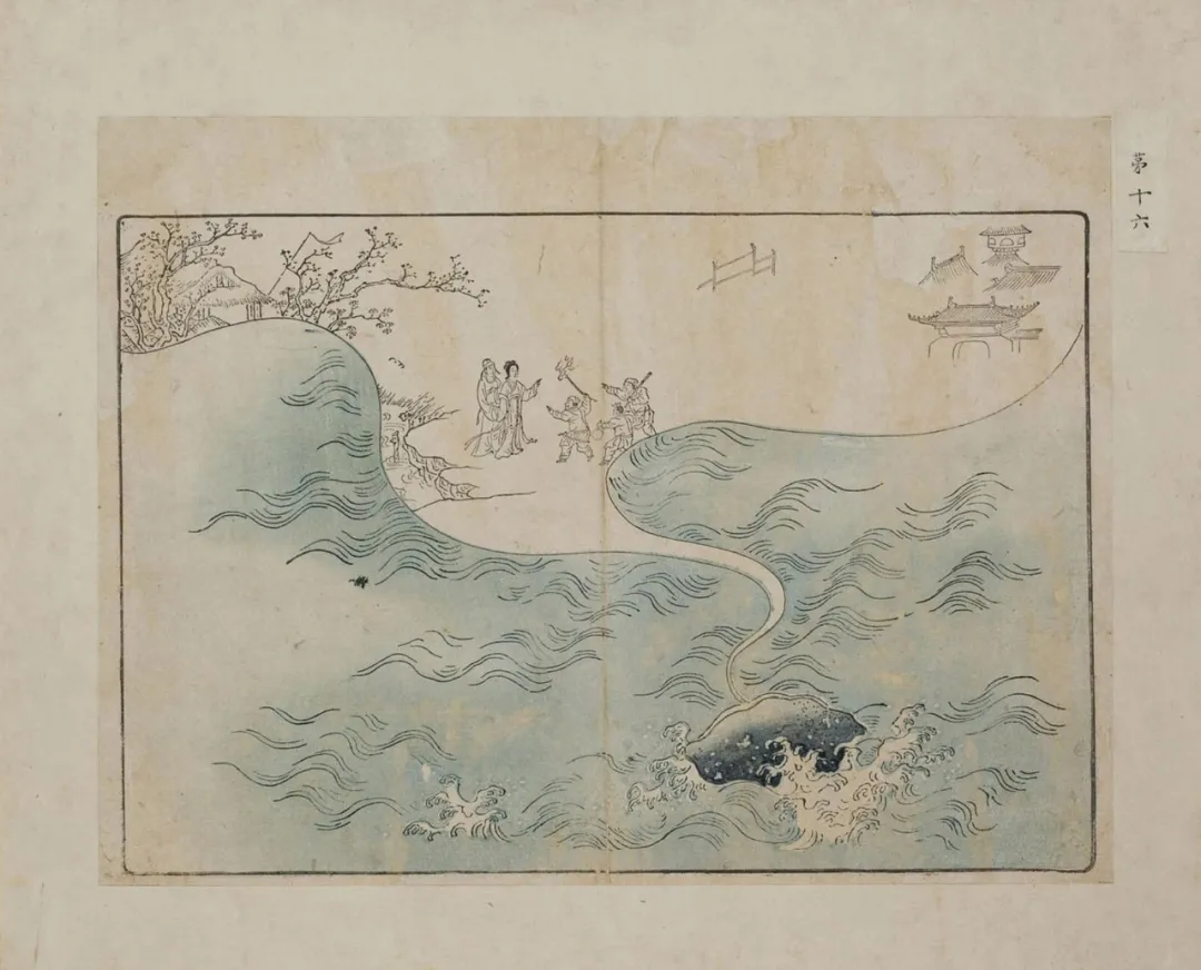 图十六:写张生于草桥店中梦莺莺私奔而来又遭贼兵掳去。图绘大海惊涛,烘托主人公的优惧惆怅。巨大的海蚌或别有象征。梦中情形以 “云烟” 状加以表现。