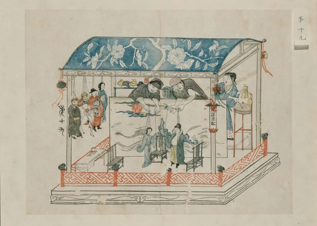 图十九:写郑恒骗婚,遭红娘嘲弄。全图以傀儡戏形式展现。