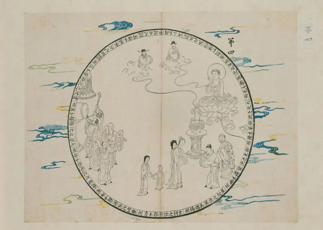 图四:写张生于禅堂再见莺莺。图绘于一六壬式盘表面,盘边刻有算皇历、运程等使用的十二次、十二辰及十二分野等内容。四周衬以五彩祥云。