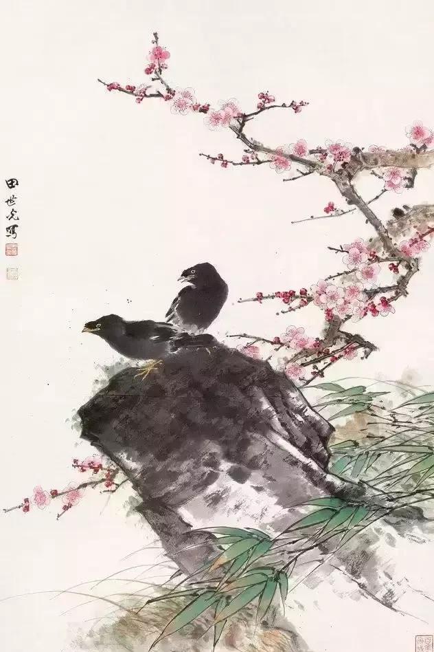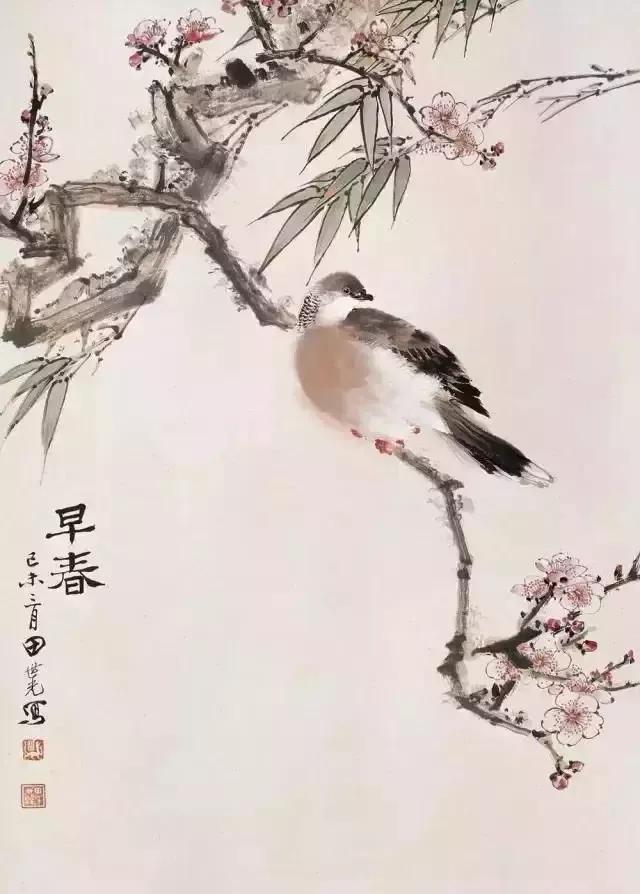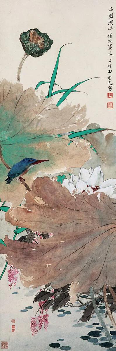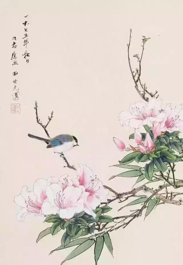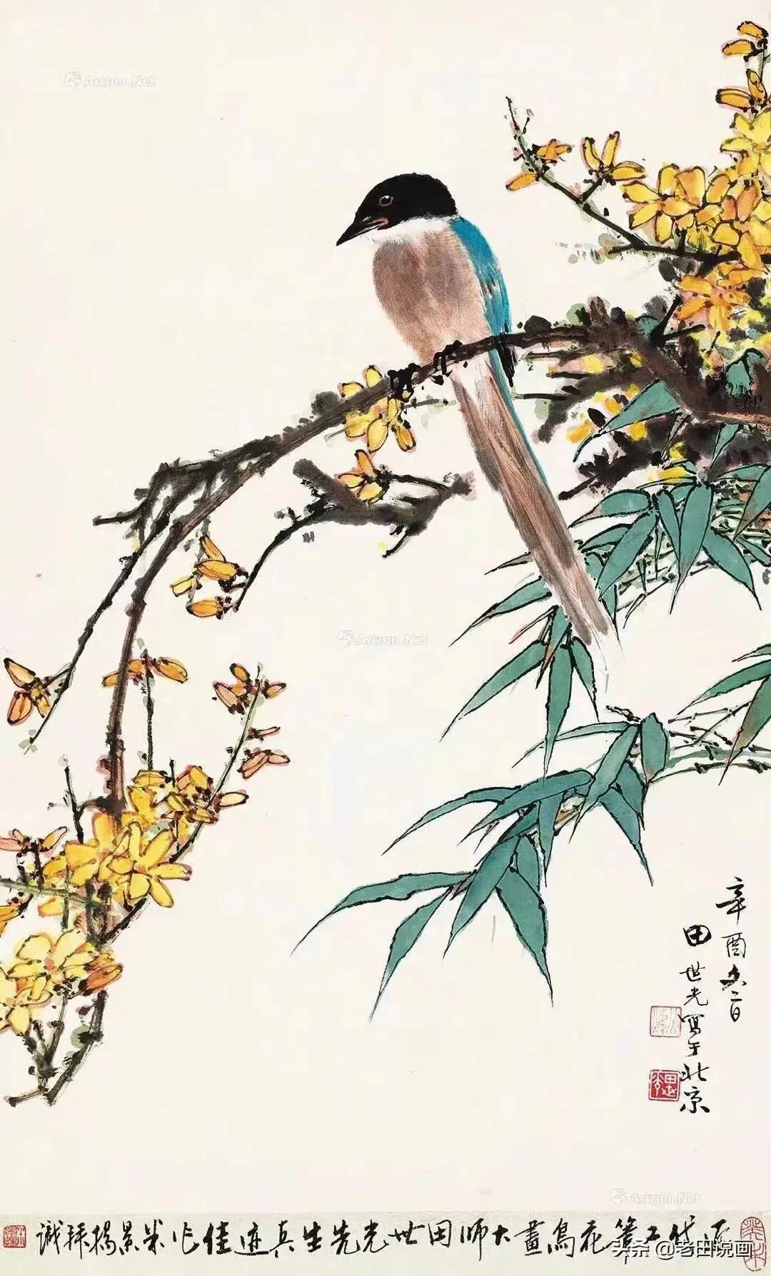 1933年,田世光考入北平京华美术学院,师承工笔花鸟画名家赵梦朱、山水画名家吴镜汀和书法、篆刻、花鸟名家于非閣、齐白石诸先生。1937年,又考入北平古物陈列所国画研究馆,历任研究员、助教、讲师,受到黄宾虹先生的教诲。1946年,而立之年的田世光迎来了他艺术人生中的重要时刻,是年春天他在颐和园长廊东头的养云轩,拜张大千先生为师,同时拜门的学生还有梁树年王学敏、俞致贞等。若干年后,也就是1983年,张大千在台湾临终前,把自己新印的画集十余册签名分赠内地画家,其中就有田世光。在画集上写道:“世光贤弟留阅,不得见者三十余年,弟艺事大进,而爱衰老矣,八十五岁叟爱。”足见张大千对得意门生的器重和厚望。