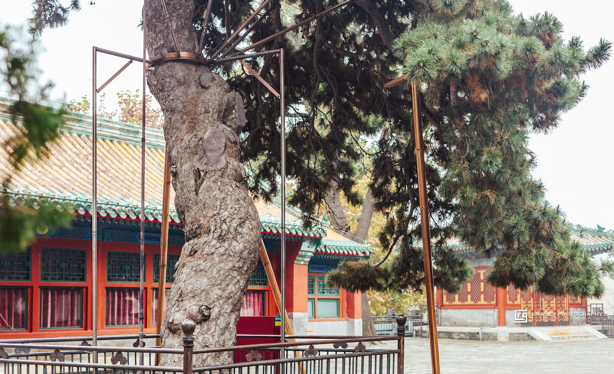 从入口拾阶而上,经过罩门沿蹬道至城顶台面;团城不大,一上来便可将主要建筑一览无余,很容易走马观花。这里古木参天,绿树成荫;在上团城的台阶处,就能看到有古树出墙“迎客”,这便是团城十分著名的“白袍将军”。团城有四宝,分别是白玉佛、白袍将军、遮荫候和大玉瓮(渎山大玉海)。其中遮荫候和白袍将军都是古树的封号。