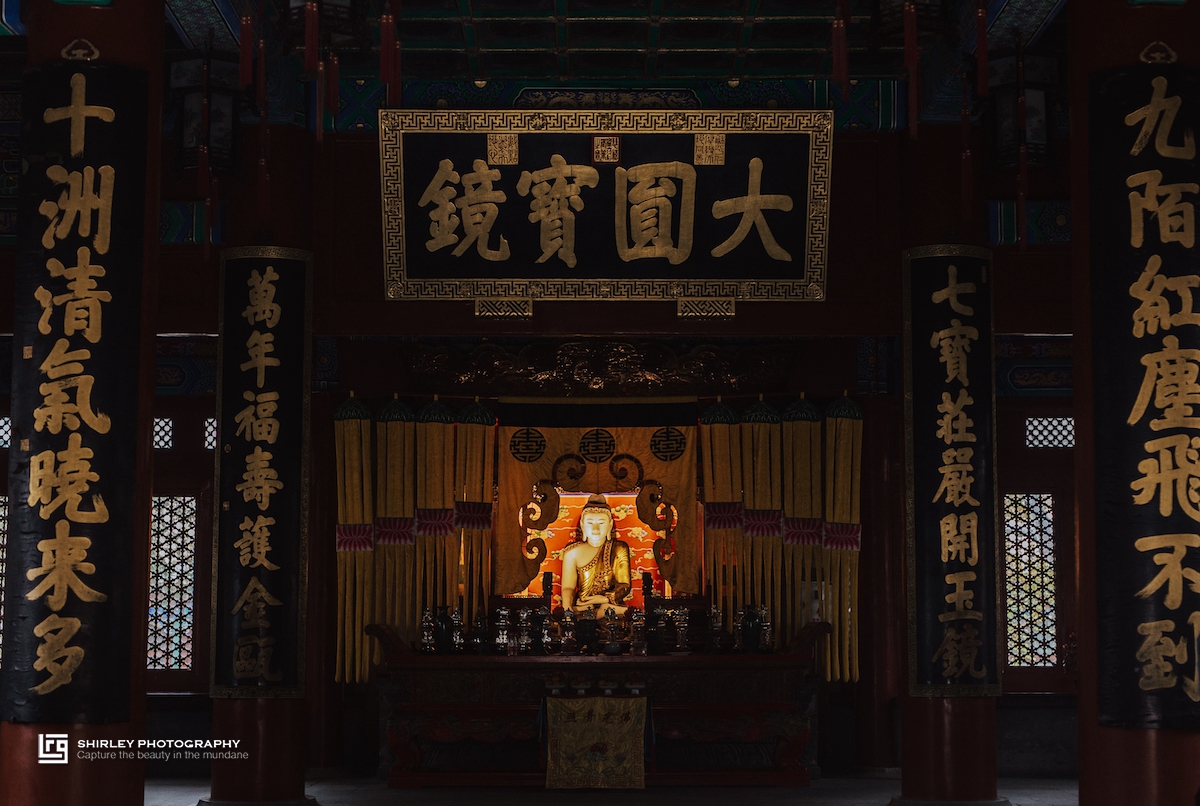 内部供奉着一尊由整块白玉雕凿而成的释迦牟尼坐像,为光绪年间明宽和尚从缅甸募化而来献给慈禧太后的礼物。头冠及衣褶中镶嵌着红绿宝石,光彩夺目。1900年,八国联军洗劫了团城,能带走的珍奇古玩一件不落;玉佛的左臂也留下了侵略者制造的刀痕。不过现在游人只能站在殿外欣赏,无法看清这一细节。