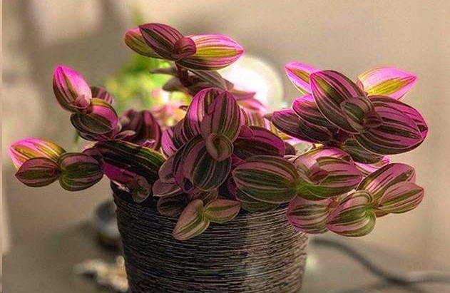 先来说吊竹梅,吊竹梅和油画婚礼吊兰都是竹节的枝条,叶片也都带着彩色,不过吊竹梅的叶片颜色是紫绿色条纹,或者紫绿夹杂银白色条纹,叶片背面是紫红色,叶片颜色整体偏暗。