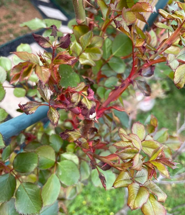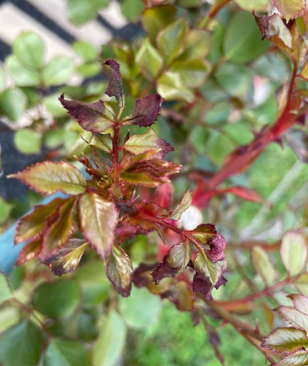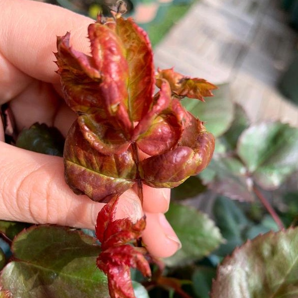 最近雨水很多,咱们的月季需要经常打药来预防病虫害,但却有花友发现,自己的月季新叶都卷曲变色了,是怎么回事呢?