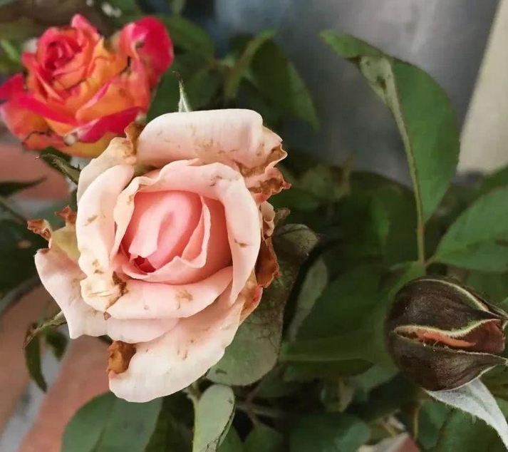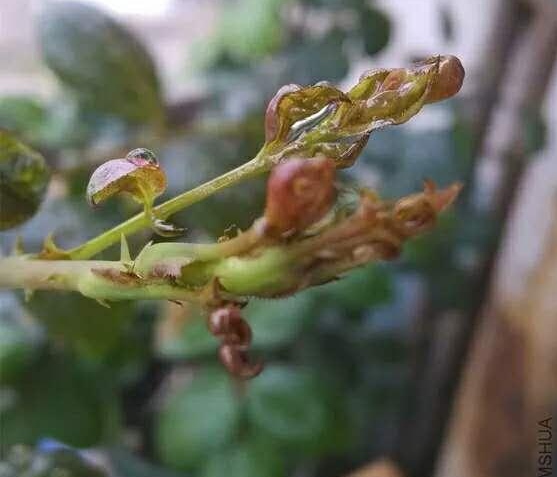 而且在这个时候,因为月季花朵已经开败了,而且蓟马是昼伏夜行的虫子,所以我们基本上是看不到蓟马虫子的,能看到的只是蓟马对月季造成的危害,主要表现为以下4个症状。