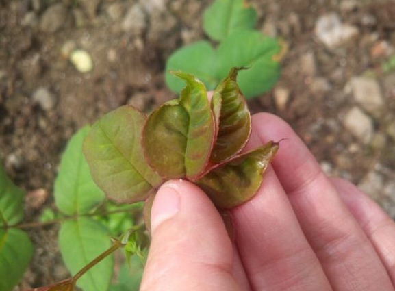 在五月份,还不是蓟马危害最严重的时候,一般月季的新芽还可以生长出来,但新生叶片会有明显的畸形现象,嫩叶有卷曲,叶片边缘发黑,等现象。