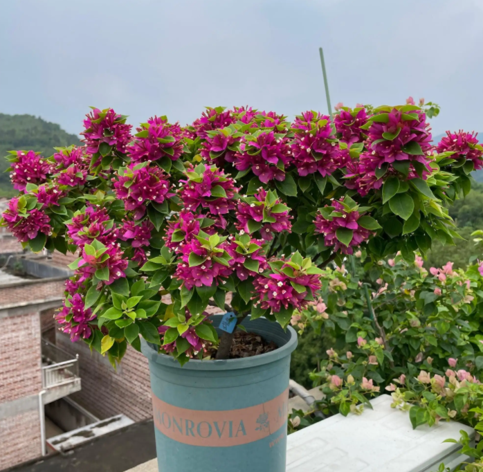 盆栽的三角梅,在雨水多的季节,尽量避雨养护,避免雨水太多,造成徒长。当三角梅有足够的开花枝时,就可以控水,每次让盆土干旱到三角梅的叶片萎蔫下垂再浇水,浇水的同时可以加入磷酸二氢钾肥催花。