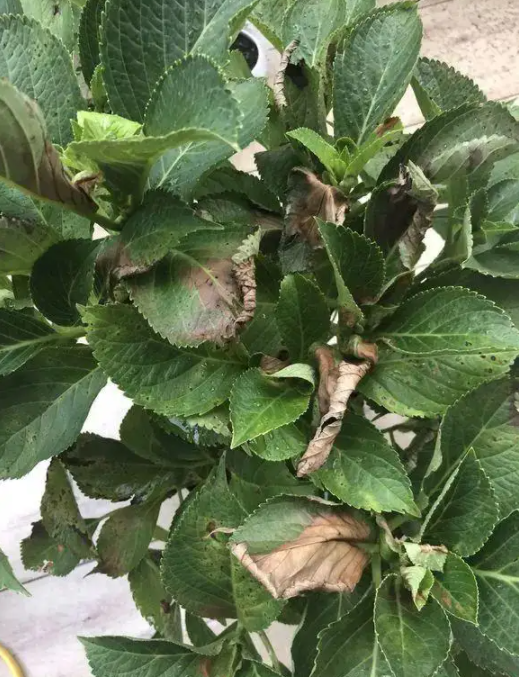 如果在夏季没有给绣球遮阴,或者遮阴不够,都很容易导致绣球晒伤,然后感染炭疽病,造成叶片中间很多瘢痕和枯萎的斑点。