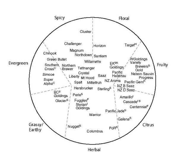。下面这张啤酒花风味圆盘图列出了大多比较常见的啤酒花: