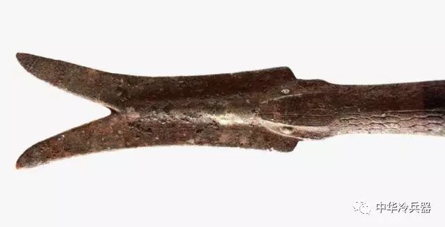 长30厘米。云南晋宁石寨山3号墓出土。叉圆形銎,銎侧无钮,銎上饰浮雕的蛇头纹,蛇背有鳞片,张口鼓目作吞食状。刃为长方形,前锋分叉。滇人特有的武器。