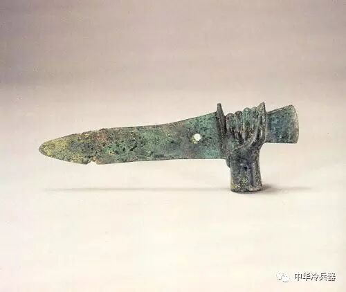 这件手形銎铜戈就如其名,整体被铸成手握短剑的形状。手和腕臂中空作为銎,剑首作内,剑腊作援,后部有一圆孔。