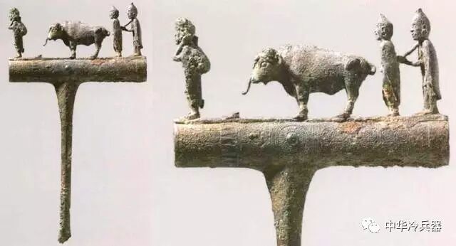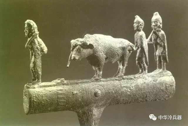 銎背上原铸四人(其中第二人已残失)和一牛。第一人背负囊;第二人应为牵牛者,惜已失落;第三人作赶牛状;第四人右肩扛物,已残,仅剩半截木棍。