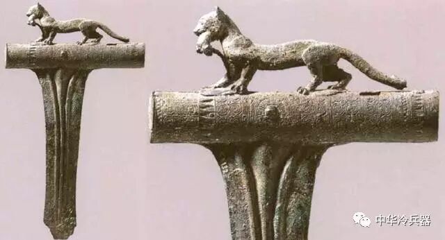 长26厘米。云南晋宁石寨山3号墓出土。扁圆銎,上刻卷云纹、同心圆纹、锯齿纹等,銎背上铸有一只豹子,其尾下垂,四足微弯踏于銎上,口衔一鼠,又目远眺作观望状。滇人特有的武器。