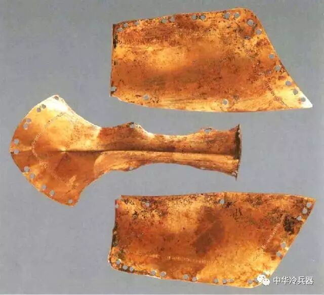 高19厘米。云南晋宁石寨山3号墓出土。金臂甲片一组三片。1994年云南江川李家山也出土过形制一样的三片铜甲片,穿连组合正好与人手臂相吻合,以此推断,云南晋宁石寨山的这三片金甲片当为金臂甲。