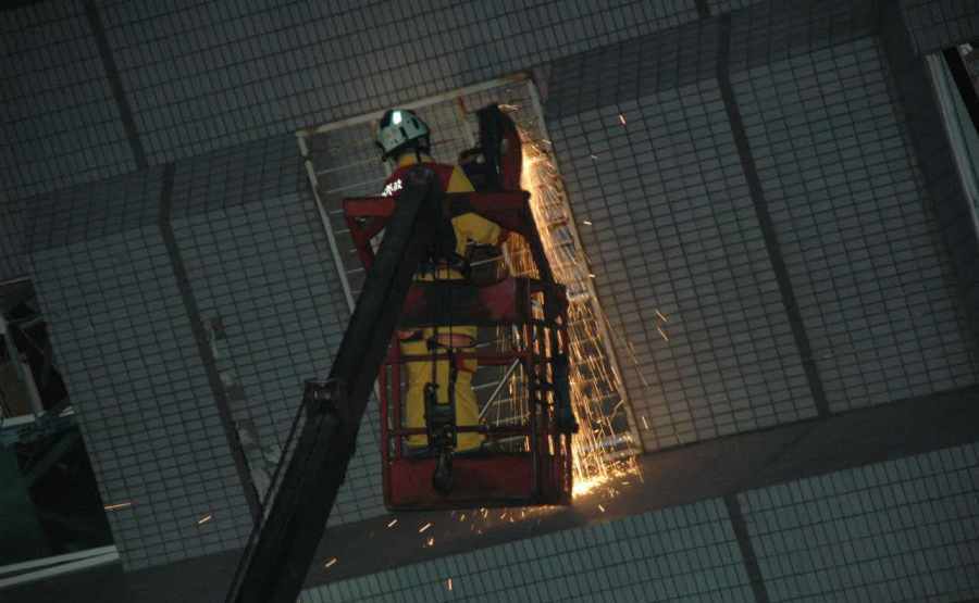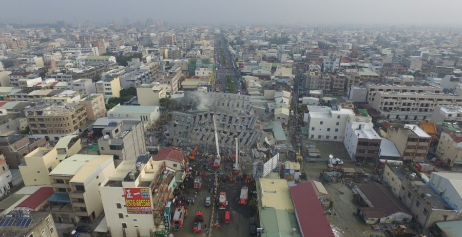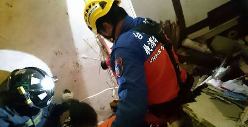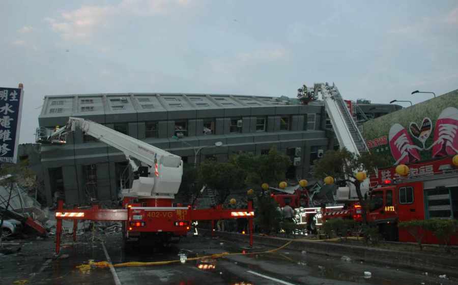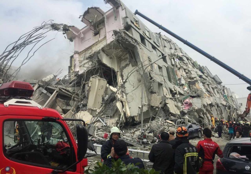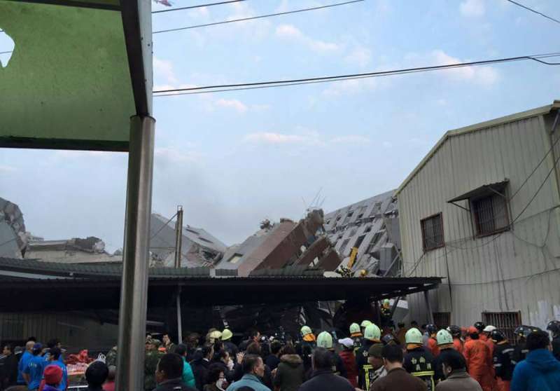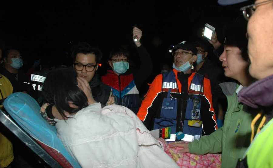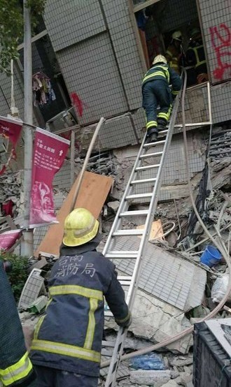 台湾地震救援者用破坏机具破窗进行救援 2016年2月6日早晨3时57分,台湾高雄发生6.7级地震,震源深度15千米。台南受灾严重,多栋建筑倒塌,救援人员用破环机具破窗进行救援,多名受困者被救出。据该市消防局统计,截至上午9时,已有3人因地震失去生命迹象。图为救援现场。