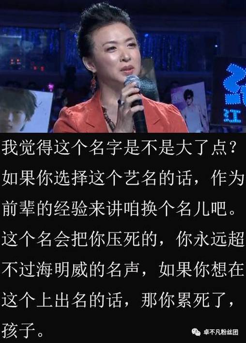 结果海鸣威回了一句:“我现在已经是明星了”,其实混娱乐圈一个好的艺名真的非常重要,像成龙原名叫陈港生,刘德华原名叫刘福荣,张国荣原名叫张发宗他们要是用原名出道,估计也不可能有这么红。还有娱乐圈最忌重名,像现在非常有名的演员宋佳,因为有个老一辈的演员也叫宋佳,所以别人都称她为小宋佳。