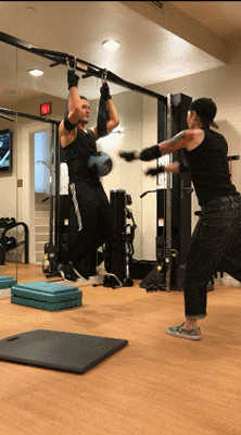 继续双腿绑上沙袋,手拿练8镑重的杠铃片,倒地抬腿,再起身直立,这动作,但凡肚子大一点的人,根本就做不到好嘛!