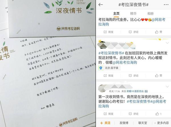 另外一个牢牢抓住这次节日节点的平台,是网易考拉海购。在这次的节日中,网易考拉表现的强势很多。3月5日起,网易考拉就开始以微博作为信息的传播平台,进行节日信息的传达。3月6号,网易考拉推出话题#考拉深夜情书#,邀请鲍春来、刘惜君等40位明星和自媒体大V为北上广晚归的姑娘们写一份“深夜情书”。目前这个话题阅读量达到2700万,且用户对于网易考拉的这次举动反馈都不错: