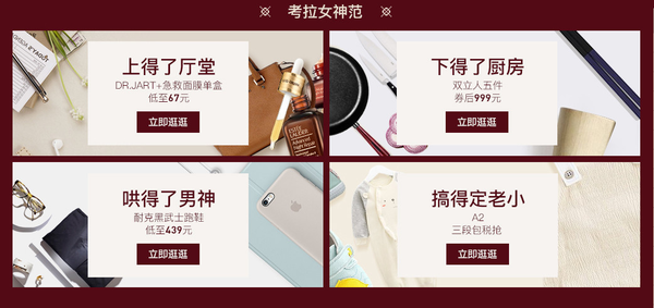 除此之外,网易考拉海购的官网版面的设计,相较于其他购物平台,也十分贴近这次的节日氛围。诸如,“考拉女神范”、“要貌美如花,也要精明持家”、“柳腰春风过,百新来装束”、“败空全世界” 这些触及女性消费者内心的话语成为了版块分类的名称。且“考拉女神范”下,又以“上得了厅堂”、“下得了厨房”、“哄得了男神”和“搞得定老小”脍炙人口的短句子将版块划分为4个主题。