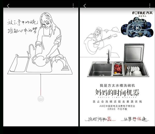 总体来讲,方太的目标群体是很明显的,而且宣传的目的也很明确。在这次女神节中,呈现出了母亲节的感觉,在眼花缭乱的活动或者表达渠道中,还是挺出彩的,具有一定的影响力;而且,“妈妈”、“梦想”又是很能引起用户共鸣的点,“要捡起心中的梦”,就从“放下手中的碗开始”,虽然在视频和H5的结尾衔接广告,但很少会引起用户的反感。