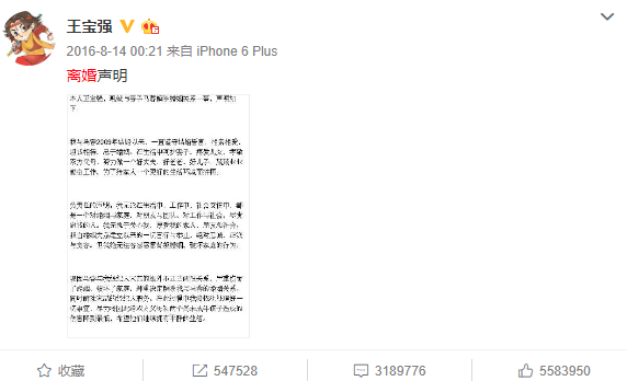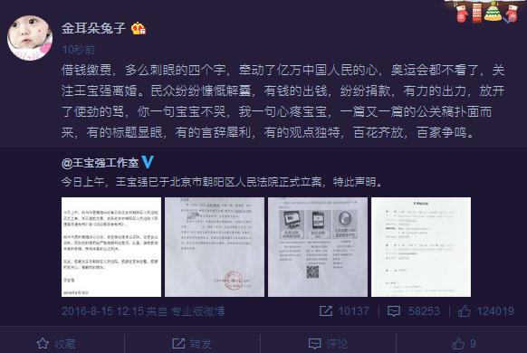 此前,王宝强起诉离婚当天,王宝强工作室曾在微博发表“立案声明”,声明中称其“与马蓉离婚纠纷案已正式立案”,并强调其是“借款交费”,一度引发网友的热烈讨论。