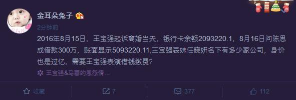 之后,马蓉发文称:“2016年8月15日,王宝强起诉离婚当天,银行卡余额2093220.1,8月16日问陈思成借款300万,账面显示5093220.11,王宝强表妹任晓妍名下有多少家公司,身价也是过亿,需要王宝强表演借钱缴费?”