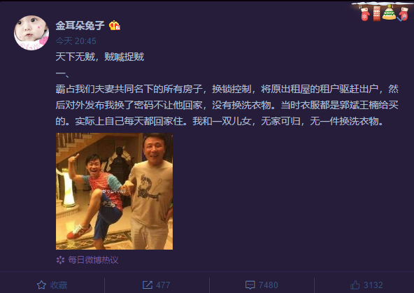 马蓉在微博中称:“王宝强霸占我们夫妻共同名下的所有房子,换锁控制,将原出租屋的租户驱赶出户,然后对外发布我换了密码不让他回家,没有换洗衣物。当时衣服都是郭斌王楠给买的。实际上自己每天都回家住。我和一双儿女,无家可归,无一件换洗衣物。”